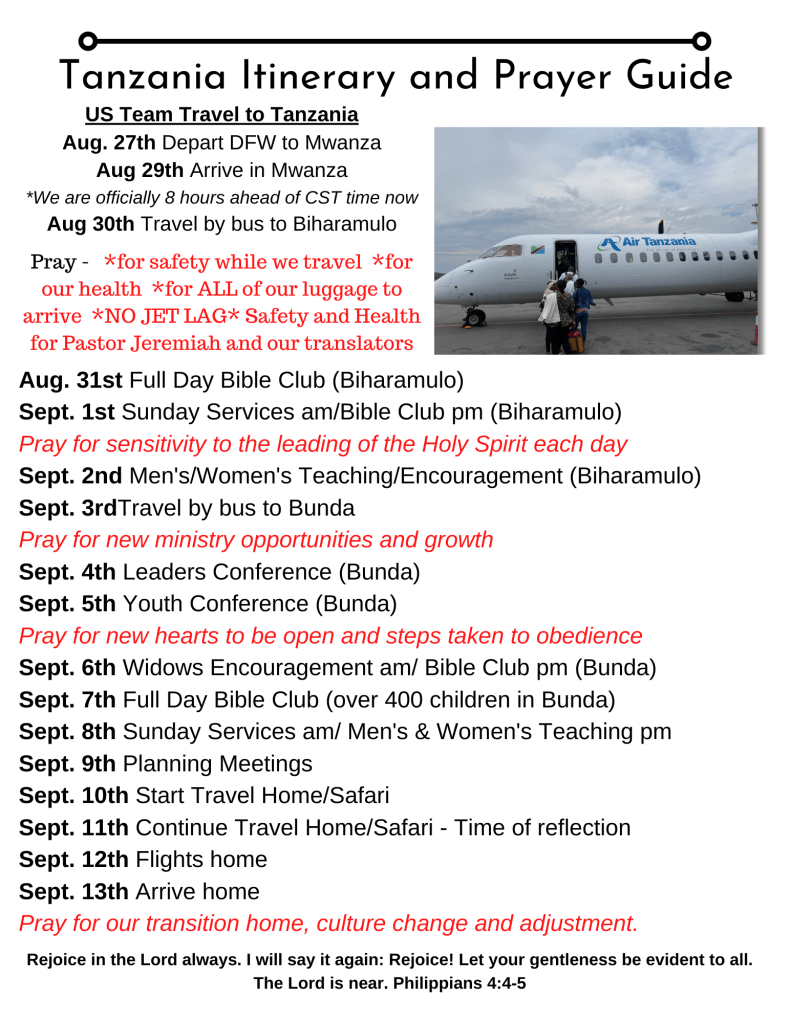 As always, we covet your prayers as we prepare for this trip and during this trip. Please start praying now for our teams (both Tanzanian and U.S.). Pray for hearts to be open for the ones the Lord gives us opportunity with and for us to be flexible and obedient to His leading. Below is a prayer guide you can use to pray for us while we are traveling and while we are in ministry.