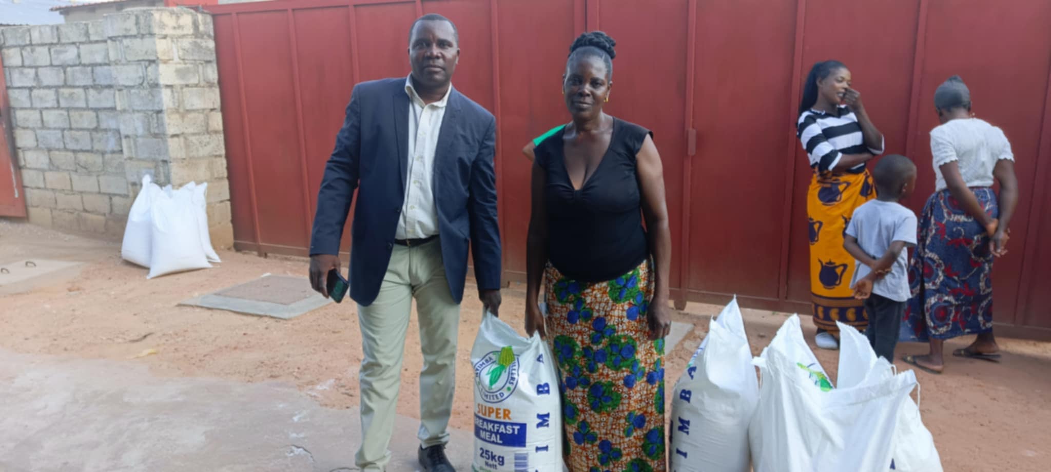 Twins, Loveness and Lovemore, attend Kids Connection Preparatory School in Zambia, their father, Mr. Mgemezulu, is blind. His daughter and her mother help him walk to and from church on Sunday’s. In this past Sunday service, he was blessed with Mealie Meal, made from finely ground maize flour and used to make several types of dishes in Zambia.