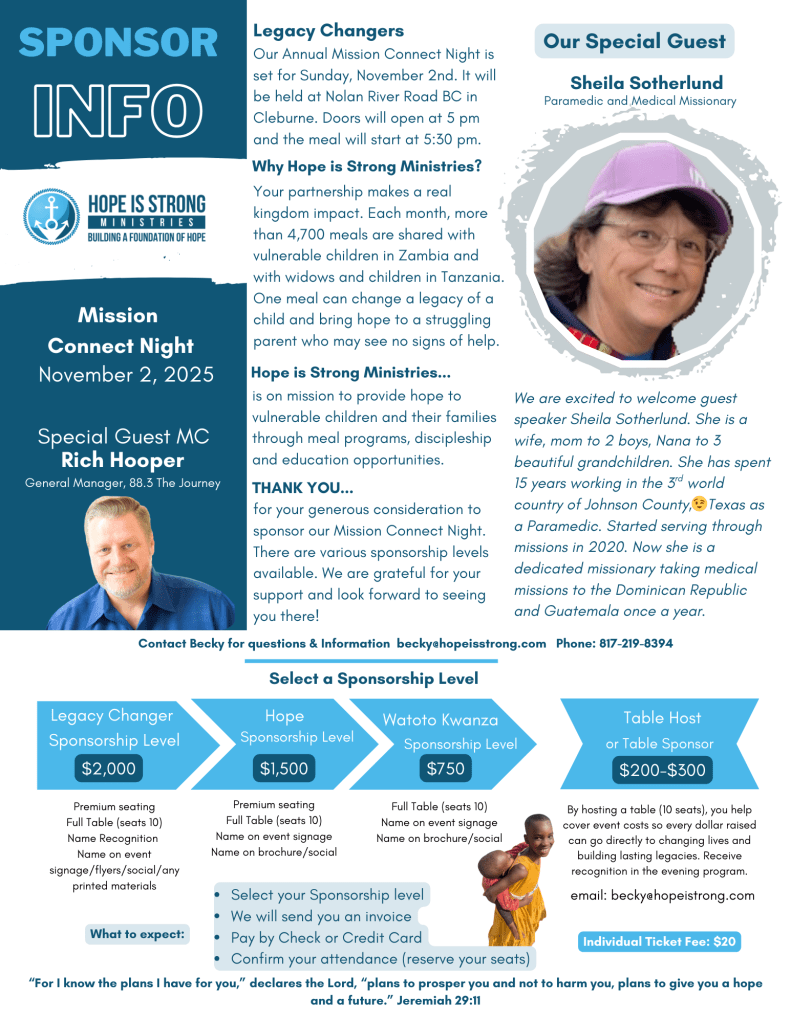 Be part of an encouraging and inspiring evening as we celebrate the many ways God is working through you and Hope is Strong Ministries. Together, we are changing legacies in the lives of vulnerable children and widows in Tanzania and Zambia.